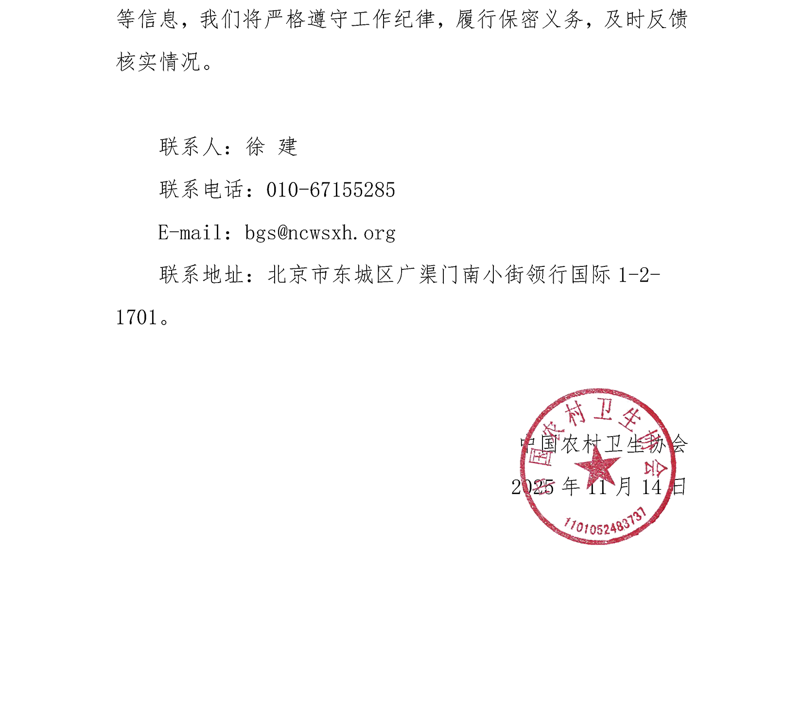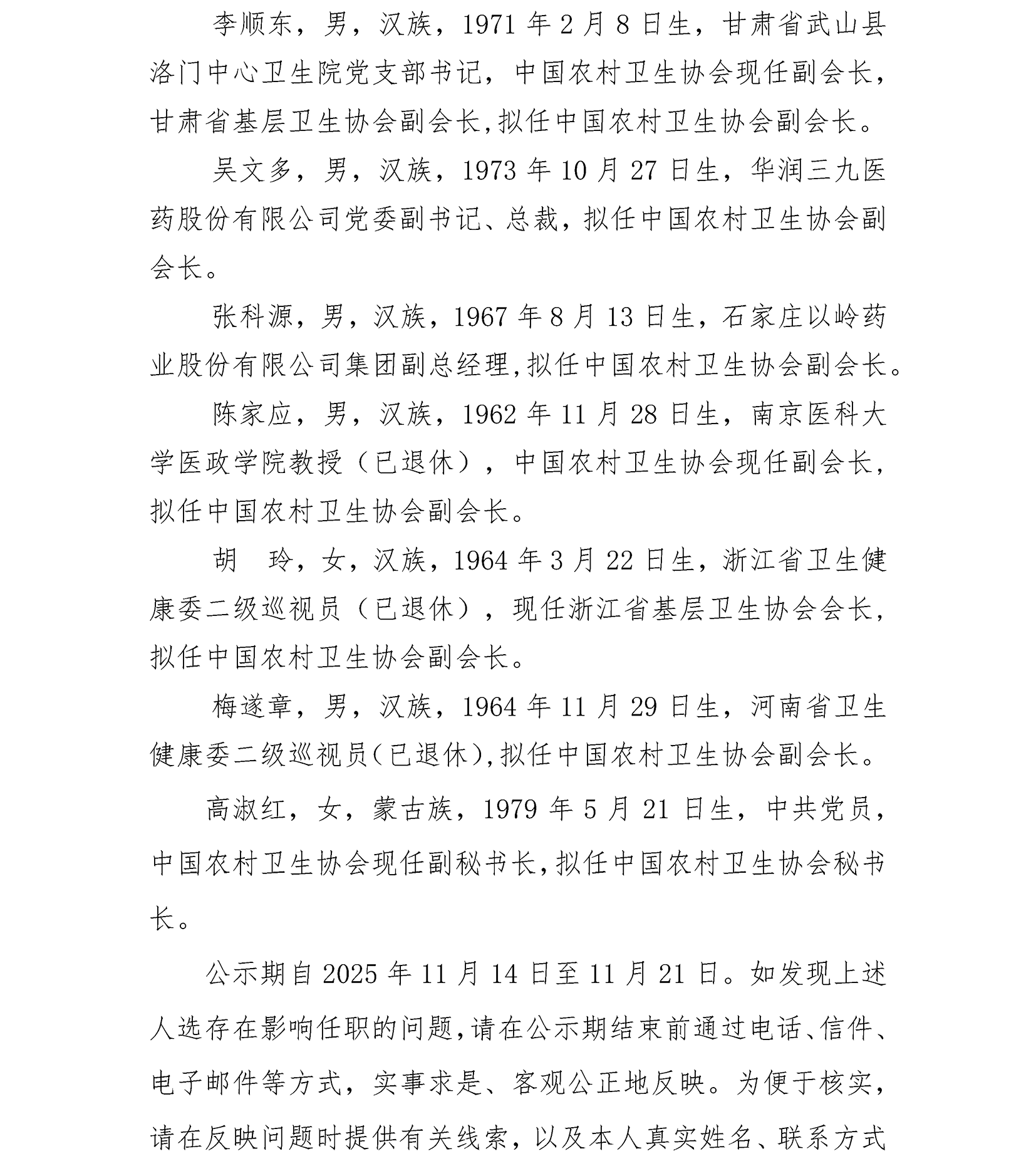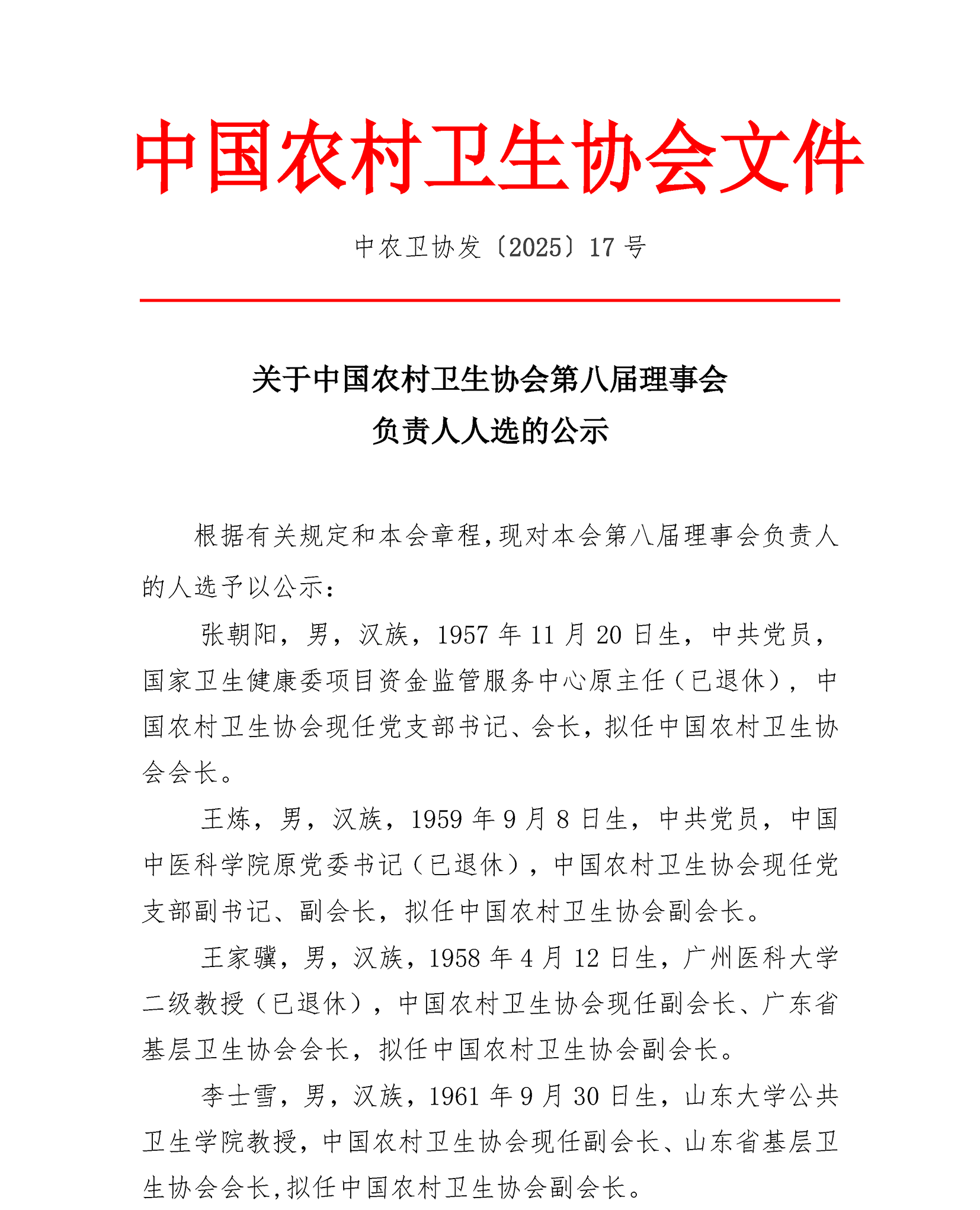关于中国农村卫生协会第八届理事会负责人人选的公示